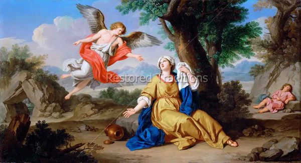 Hagar, the Egyptian handmaiden of Sarah, was the mother of Ishmael, Abraham’s first son. When Isaac, Sarah’s son, was born, Ishmael mocked his younger brother so that Sarah asked Abraham to banish Ishmael, together with his mother. Abraham provided them with bread and water, and sent them off into the desert of Beersheba. When the water was spent, Hagar put Ishmael under a bush to die, and then she sat some way off, weeping. But an angel appeared and disclosed a well of water near by, so mother and child were both saved. This artwork, by Bottani, depicts the scene of Hagar’s and Ishmael’s deliverance by the angel.