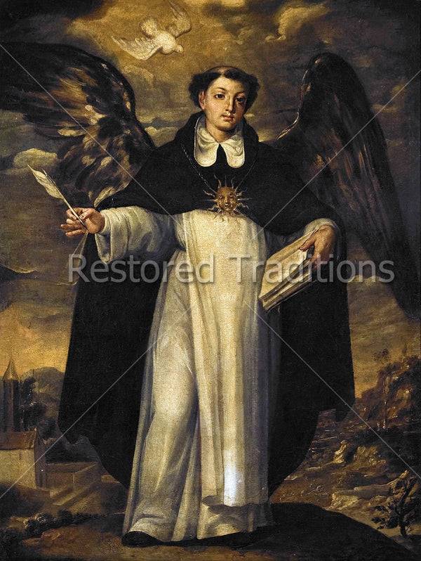 This is a portrait of Saint Thomas Aquinas, the Angelic Doctor, depicted with angel’s wings, being inspired by the Holy Ghost to write of theological truths. St. Thomas Aquinas is the Patron Saint of Education, Universities, and Schools. Artwork by Risueño.